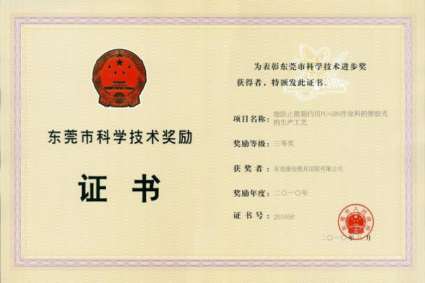 东莞市科学技术奖励证书